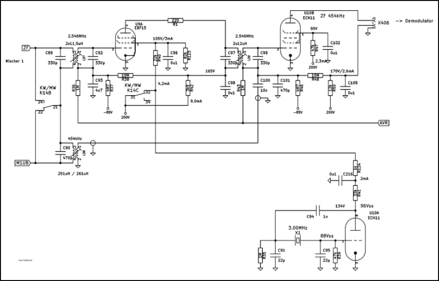 Die erste ZF von 2,546MHz wird mit der Röhre U9=EBF15 Verstärkt. Für die beiden Frequenzbereiche unter 3,5MHz wird diese Stufe abgeschaltet weil hier nur ein Einfachsuper mit einer ZF von 454kHz arbeitet. Die Umschaltung erfolgt mit Relais K14.Die 2,546MHz wird in der 2.Mischstufe mit U10=ECH11 auf 454kHz umgesetzt. Der 3MHz-Quarz-Oszillator arbeitet wie üblich mit dem Triodensystem der U10=ECH11. An der Anode der Hexode der U10=ECH11 gelangt die 454kHz-ZF über einen 2-poligen HF-Stecker zur Demodulatorgruppe.Die Hexode arbeitet für die 454kHz des Einfachsupers als ZF-Verstärker. Beide Röhren, U9=EBF15 und die Hexode der U10=ECH11 werden geregelt.