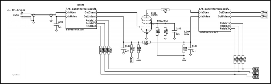 Von der HF-Gruppe gelangt die ZF von 454kHz an das erste variable Bandfiter. Die geregelte Röhre U11=EBF15 verstärkt das Signal. Dann folgt das zweite variable Bandfilter. Beide Bandfilter sind identisch. Mit Mini-HF-Relais wird die Bandbreite in 4 Bereiche umgeschaltet.Ein Problem mit der Spulengüte:Das Bandfilter hatte ich zunächst mit ZF-Spulen wie sie heute oft verwendet werden aufgebaut. Dabei zeigte sich ein Problem. Bei der kleinsten Bandbreite war die Dämpfung mit etwa 26dB eindeutig zu hoch. Nach einigen Versuchen habe ich festgestellt das die zu geringe Güte der Spulen die Ursache war. Die verwendeten Spulen hatten eine Güte von etwa 100. Ich habe etwa 15 verschiedene Spulenkörper getestet. Deren Güte lag nie über 120! Bis ich schließlich einen Siemens-Schalenkern in meinen Vorräten gefunden habe und diesen dann entgegen meiner Überzeugung testete. Damit erreichte ich zu meinen Erstaunen eine Güte von über 300! Das Kernmaterial war M33.Damit ausgerüstet waren die Dämpfungen bei allen 4 Bandbreiten etwa identisch. Ein kleiner Unterschied von etwa 6dB wurde mit einen Widerstand ( R146=3k7 ) behoben. Der wird bei für die 3 breiteren Bandbreiten parallel zum Primärkreis geschaltet. Die Güte des primären Kreises ist weniger wichtig. Starken Einfluß hat der sekundäre Kreis. Weil ich nur 2 Schalenkerne mit M33 hatte wurde der primäre Kreis mit einem etwas ungünstigeren Schalenkern bestückt.