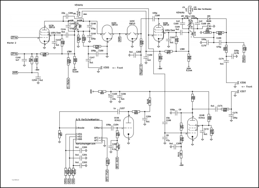 Röhre U15A=EBF15. Eine Diodenstrecke der Röhre U15C=EBF15 erzeugt die Regelspannung für die AVR. Diese Röhre läuft