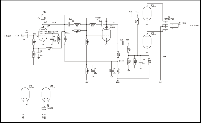 Die NF wird mit der Pentode der Röhre U5=ECF12 verstärkt. Auch diese Stufen sind mit der Schaltung ohne Kathodenwiderstand realisiert worden. Mit den Widerständen R2/R3 wird die Anodenspannung der Pentode eingestellt und damit dessen Arbeitspunkt. Die Triode arbeitet als Phasenumkehrstufe. Mit R11/R8 wird der Arbeitspunkt eingestellt. R10/R6 ist eine NF-Kopplung damit an der Anode der Triode eine gegenphasige NF entsteht. Mit R7 erfolgt eine geringe Korrektur damit beide Steuerspannungen gleich groß sind.Die Endstufe ist mit der Röhre U4=EDD11 bestückt. Die EDD11 ist die einzige Endröhre aus dieser Reihe mit Stahlkolben. Um die möglichen 5W Ausgangsleistung zu erreichen muß die EDD11 bis ins Gitterstrom ausgesteuert werden. Das bedeutet eine hohe Steuerleistung. Die kann nur mit einen Eingangstrafo bereitgestellt werden. Ich habe aber nur eine RC-Ansteuerung ohne Gitterstromeinsatz. Die Endstufe bringt deshalb und auch weil der beschaffbare Ausgangstrafo ungünstig ist nur eine Ausgangsleistung von 600mW. Das reicht für den kleinen internen Lautsprecher und für einen Kopfhörer vollkommen aus.Die Endröhre wird mit einer festen Gittervorspannung betrieben. Das ergibt pro Röhre einen Anodenstrom von etwa 5mA. Die Endstufe arbeitet mit AB-Arbeitspunkt, die Stromaufnahme steigt also bei höherer Aussteuerung.