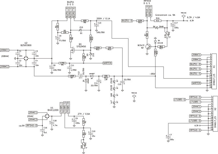 Das Netzteil muß zwei stabile Spannung mit +200V und -85V liefern. Die +200V werden mit zwei VMOS (BUZ51 und STD2N50) stabilisiert. Die -85V sollten ursprünglich mit einen 85V-Glimmstabi erzeugt werden. Das hatte einen Nachteil: die Zündspannung! Das hatte einen hohen Spannungssprung nach dem Einschalten zur Folge. Deshalb habe ich stattdessen eine Reihe von Z-Dioden eingesetzt.Die Heizungen werden alle mit Gleichspannung versorgt. Das erspart die Verlegung von verdrillten AC-Leitungen. Jetzt kann ein Pol der Heizung direkt nach GND und nur die zweite Leitung muß gegen HF abgebockt werden. Wo möglich habe ich Heizspannungen sowohl für die E-Reihe als auch für die U-Reihe bis zu den Röhren verlegt. Man weis nie welche Röhre man beschaffen kann. Das Netzteil liefert 6,3V/4,6A ( Spitze 9A ) für die E-Reihe mit einen IRF540 und BC547. Für die U-Reihe liefert 20V ein Festspannungstabi UA7820. Und 27V liefert ein einstellbarer Stabi LT1085CT. Der erhöhte Strombedarf nach dem Einschalten ist berücksichtigt.Eine Besonderheit gibt es. Früher wurden die Anodenspannung mit einen Röhrengleichrichter versorgt. Die Spannung erreichte erst dann seine volle Höhe wenn die Röhren aufgeheizt waren. Die Halbleiternetzteile dagegen liefern die Spannung bevor eine Röhre bereit ist. Das kann die Kathoden unnötig belasten. Die Röhren sind immerhin bis zu 70 Jahre alt. Deshalb verwendet das Netzteil die überflüssigen Diodenstrecken der Röhre U11=EBF15 über die Leitung “WARTEN”. Erst wenn diese Dioden leitend werden, erscheint die +200V in voller Höhe.